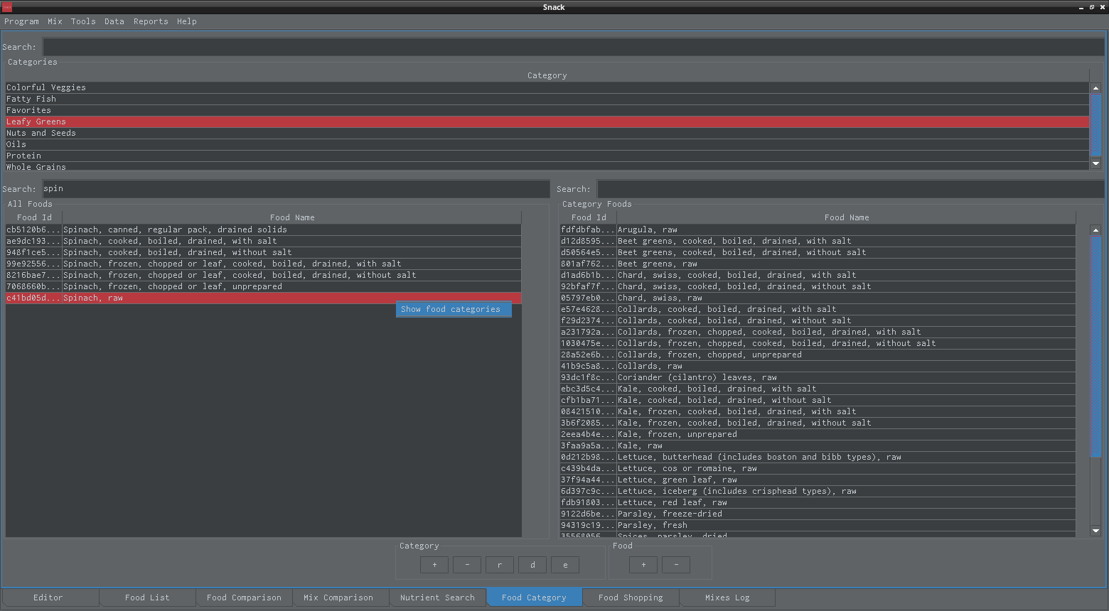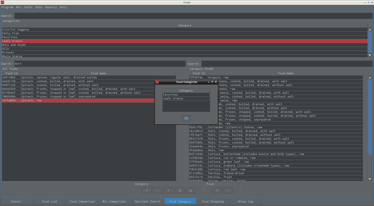 Spinach is in the “Favorites” and “Leafy Greens” categories.¶